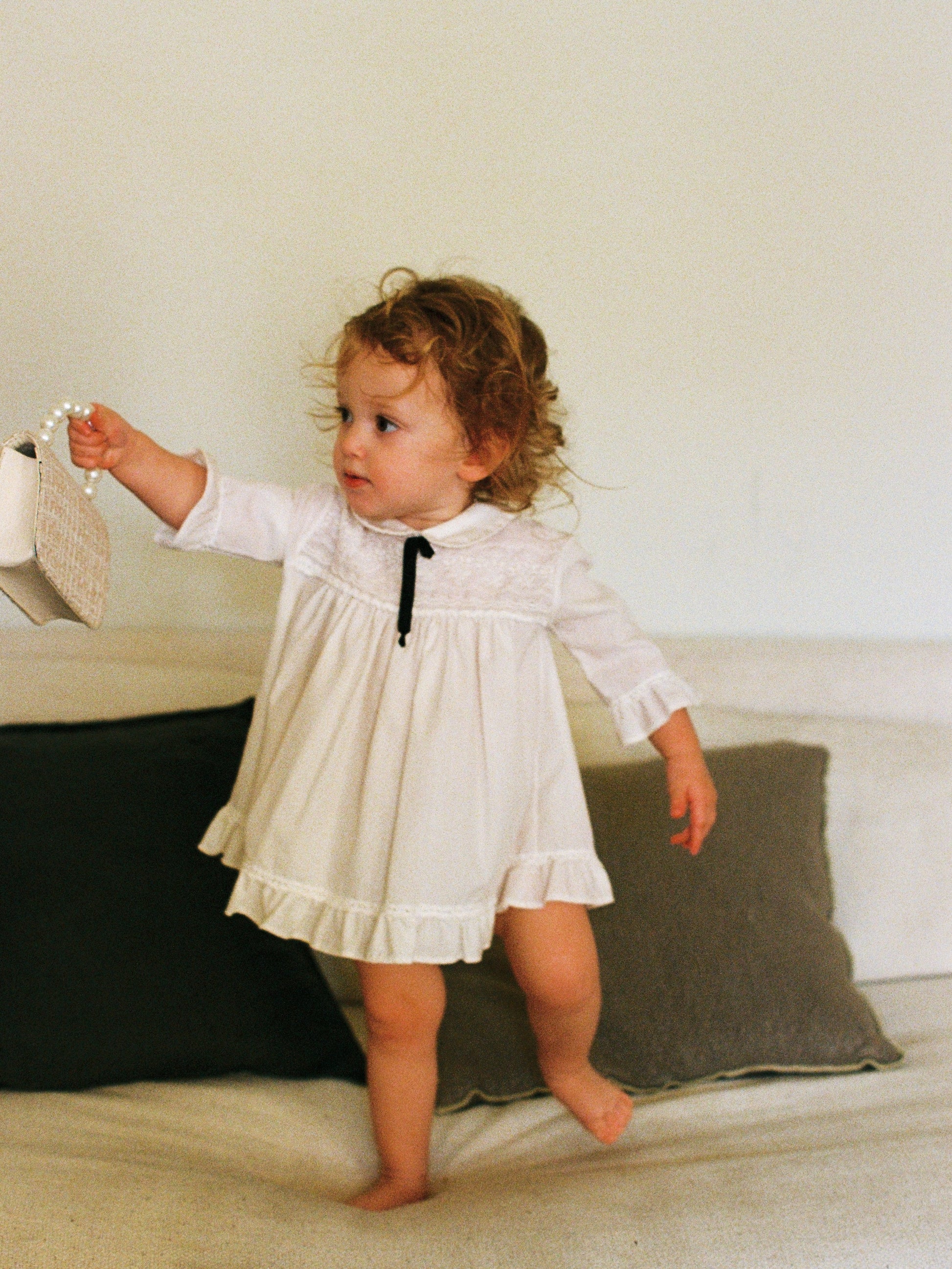 Monochromatic floral embroidery on the chest and in the ruffles at the bottom and at sleeves. Likely a cotton & polyester blend. Buttons down the back. Sweet little collar lined with monochromatic thread. Brand is Her Majesty. Size T-2.