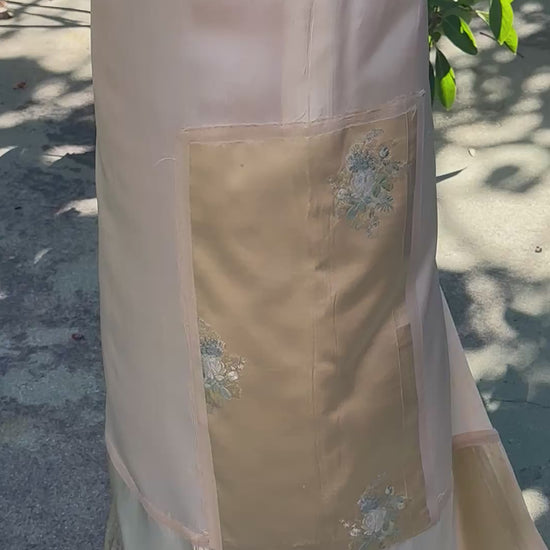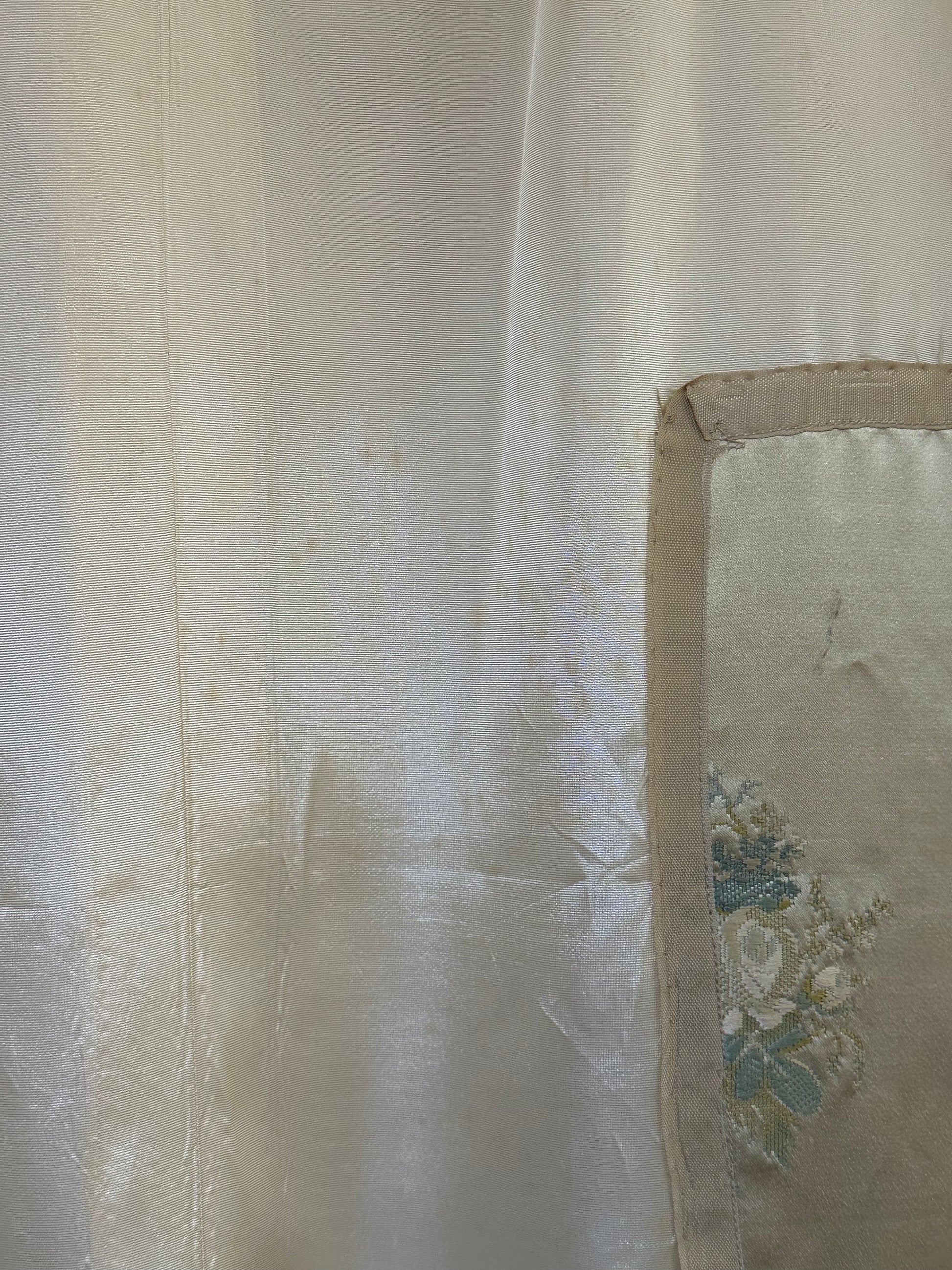 Appears as a Nylon & Silk blend. Silk panels featuring floral brocade. Maxi length. Amazing colors with muted tones. A bit sheer. Open slit at the back.